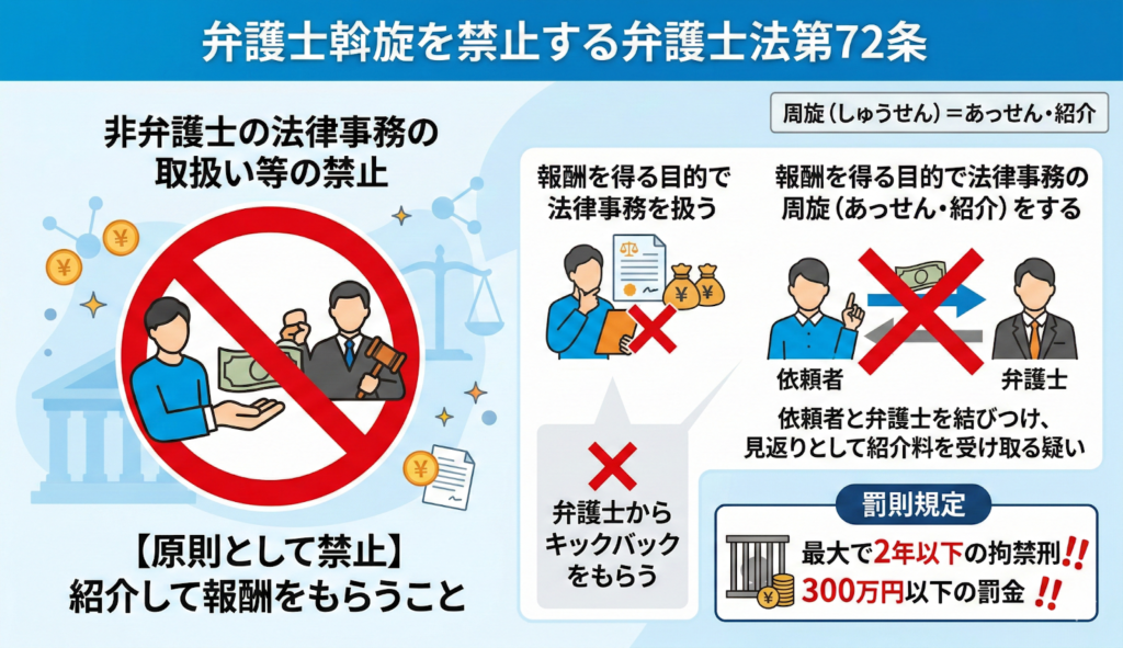 この弁護士法第72条では「非弁護士の法律事務の取扱い等の禁止」について定められており、「弁護士でない者が、報酬を得る目的で法律事務を取り扱ったり、報酬を得る目的で法律事務の周旋(しゅうせん)をしてはならない」とされています。また、金銭を得る目的で周旋をした場合、最大で2年以下の拘禁刑または300万円以下の罰金という規定もあります。