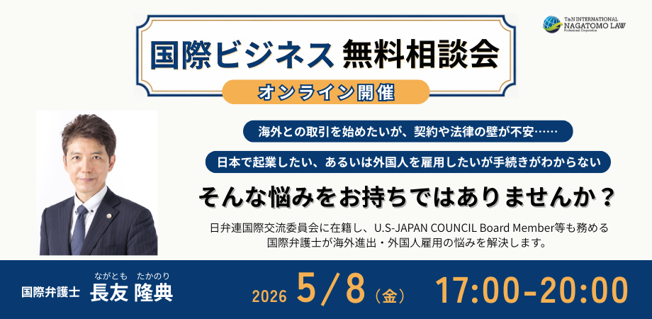 長友国際法律事務所では、海外へのビジネス展開や外国企業との取引を考えている日本企業の方、日本在住もしくは日本進出を考えている外国企業の方を対象に、無料ビジネス相談会を開催いたします。